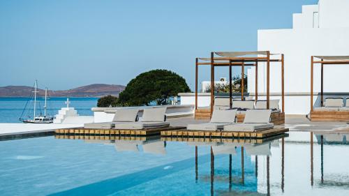 Das Hotel ist im klassischen Kykladen-Stil eingerichtet. Ein Spa, ein Infinity-Pool auf 2 Ebenen und ein privater Strand gehören zum Hotel. Es besteht aus mehreren eleganten Bungalows und Villen. Einige davon haben private Pools oder Jacuzzis.